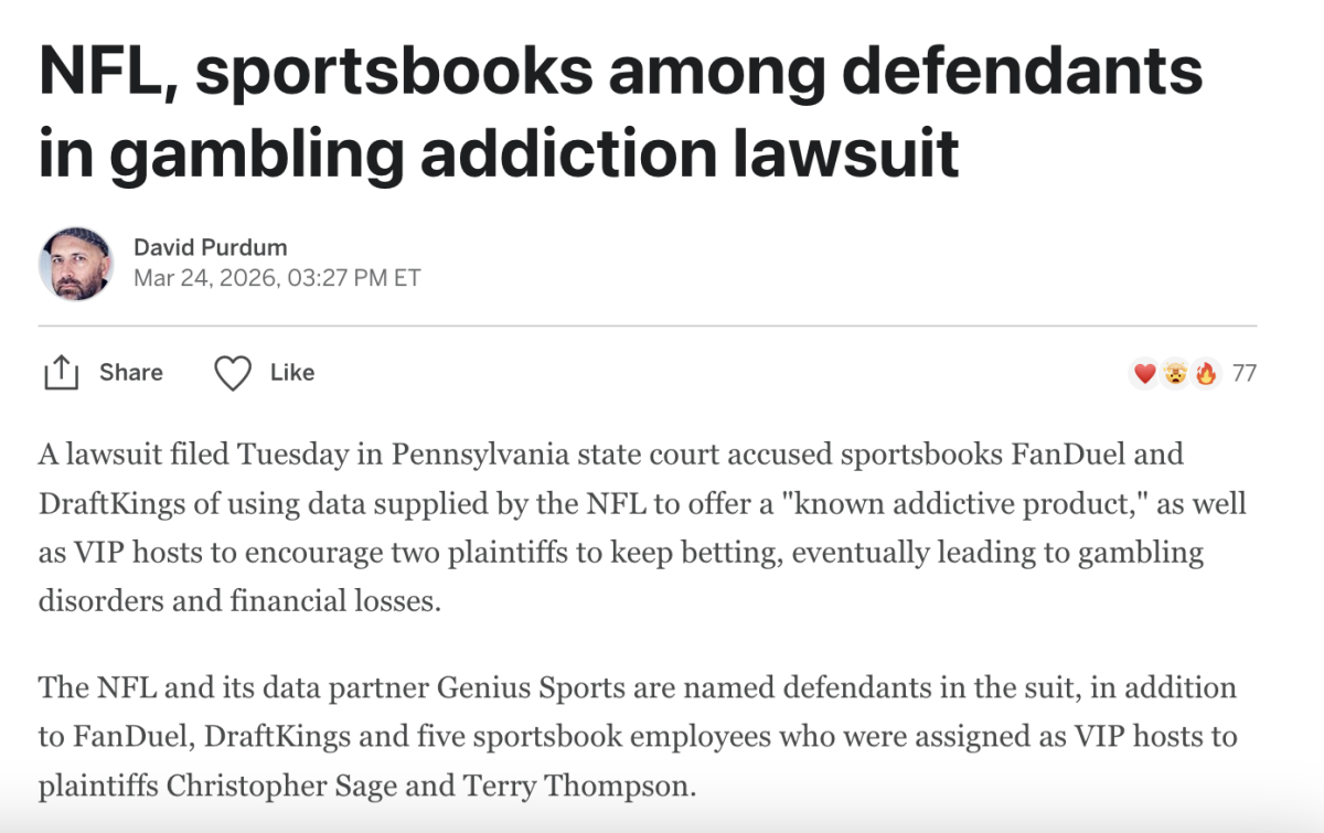 - Lawsuit Accuses Sportsbooks of Using Addictive Technology - Hours after a Los Angeles jury found that Meta and YouTube harmed a young user by utilizing addictive features, attorneys involved in the case filed suit against DraftKings and FanDuel and accused the sportsbooks of using technology and methods similar to those of social media companies to keep customers betting and causing some of them to develop gambling addictions. In a personal injury complaint filed Wednesday in Massachusetts state court, attorneys allege that the sportsbooks track users' behavior and use that data to target them to keep betting "precisely when they're most susceptible, like late at night or after a big loss." "Defendants have full visibility into users' concerning betting patterns and then push the users to gamble further through targeted advertising, personalized 'bonus' incentives, and 'push' notifications," the suit alleges. (more from ESPN)