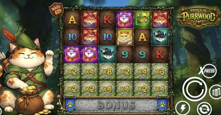Prince of Purrwood blends a charming feline theme with deep, feature-packed mechanics. Cascading reels, additive global multipliers, unlockable cells, and persistent free spin features make every spin unique.