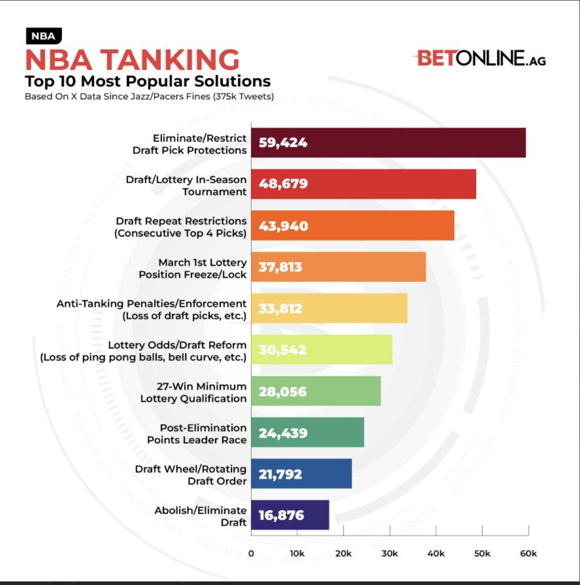 The graphic below, courtesy of BetOnline.ag, was generated using X data (tweets) and it identifies the Top 10 most popular NBA taking solutions.